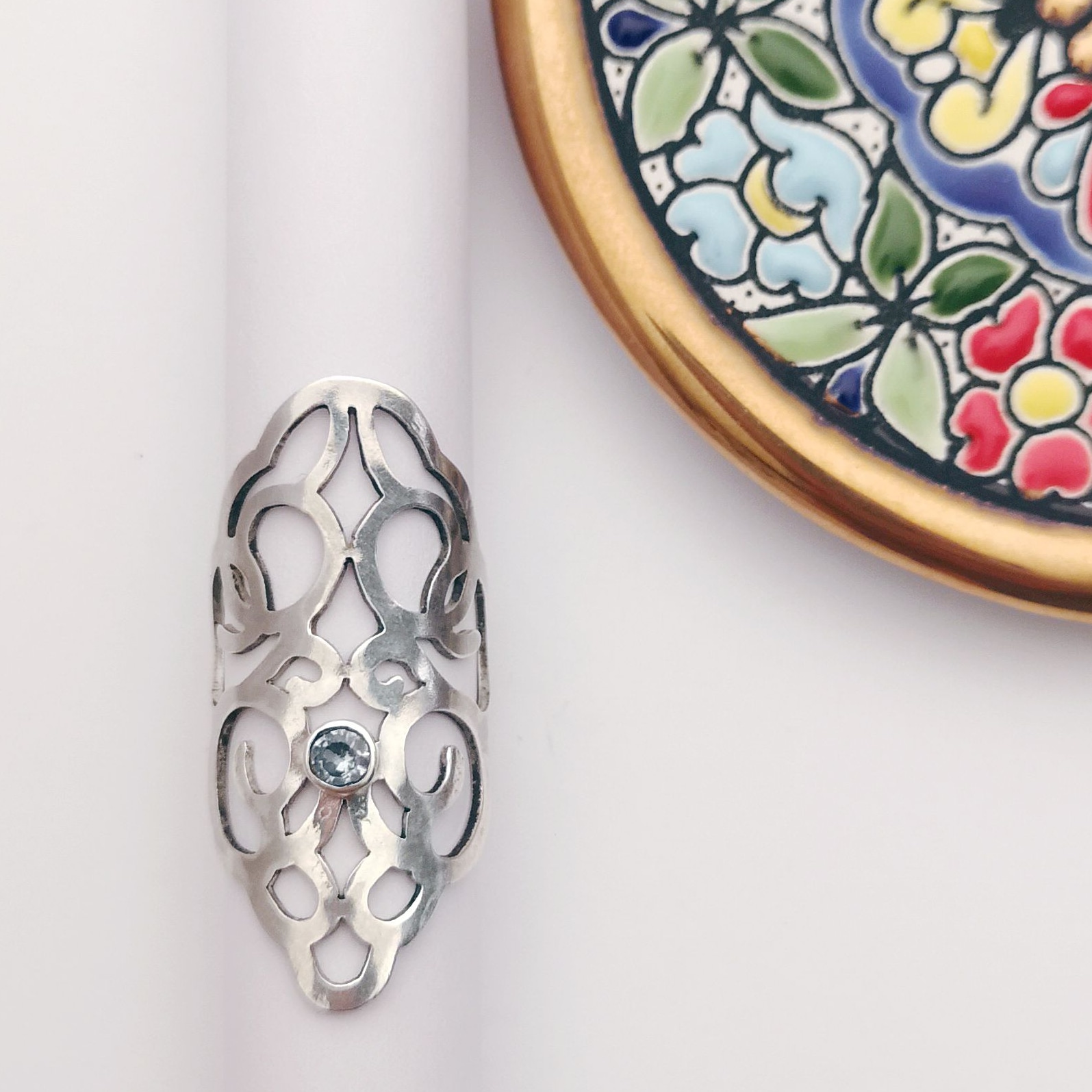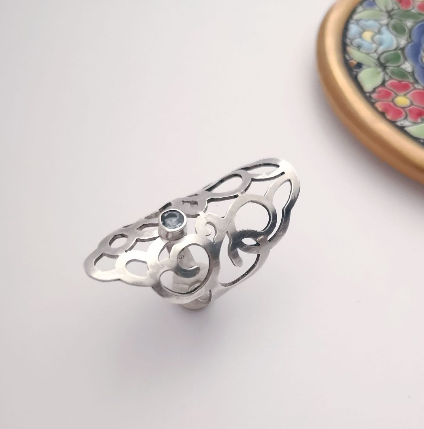 Sterling silver adjustable ring with blue zircon in a baroque style